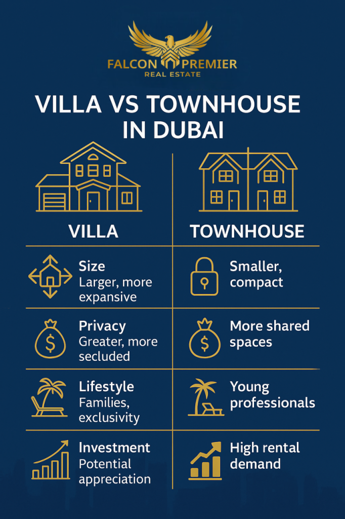 At Falcon Premier Real Estate, we guide you through every nuance of the “villa vs townhouse Dubai” decision—choosing the right property type for your lifestyle, investment goal, maintenance comfort and budget.